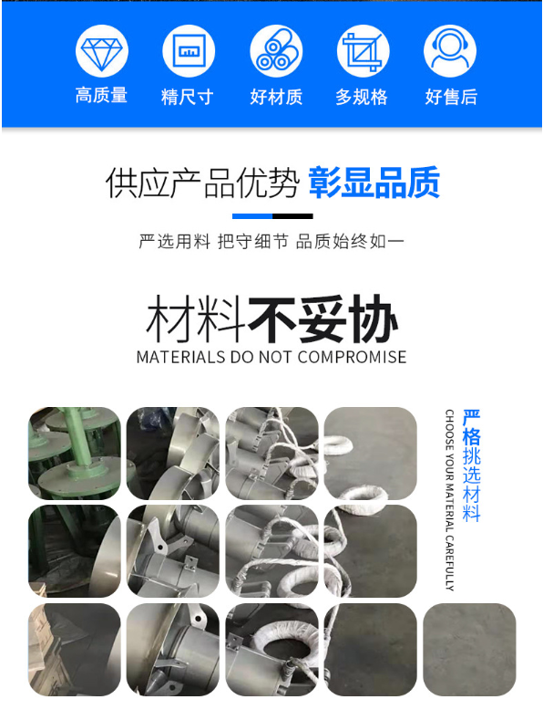 玻璃钢叶轮,高强度复合材料,整体式成型、耐腐蚀能力强、水阻小、重量轻、效率高,几何基地对称性好、动平衡度高,为国内外创始。潜水搅拌机在污水处理厂适用,工艺流程中推进拌和富含悬浮物的稀泥浆、污水、工业进程液体等,可以创立水流,使拌和功用加强,不让污泥进行堆积,在市政以及工业污水处理工艺流程上发挥了很重要的效果。